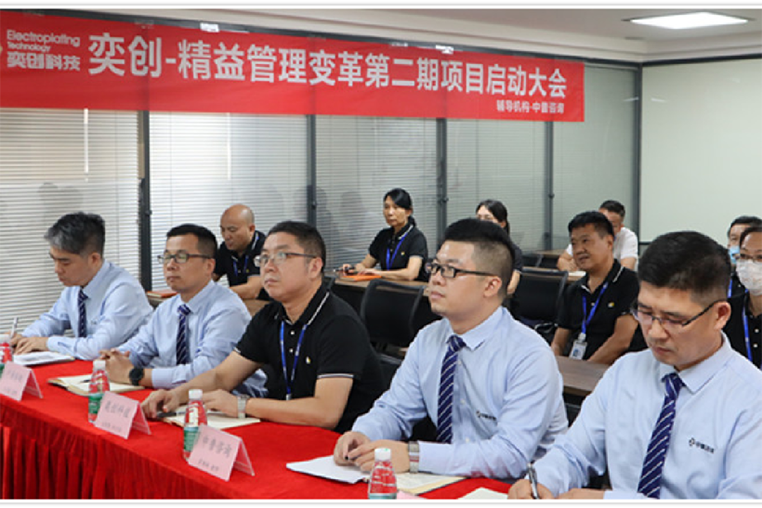2021年11月8日,东莞奕创表面处理科技有限公司精益管理变革第二期项目启动。奕创科技郑总、张副总、彭副总、中普咨询常务副总王文超、副总罗泽秋、项目副总王世来、项目经理王照友,奕创科技各相关部门负责人及项目组成员等参加了会议。(会议由精益办李主任主持)